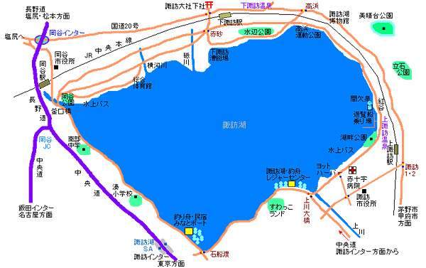 | アクセス | 中央自動車道「諏訪I.C」で降りて、インター出口を諏訪湖方面へ左折。そのまま直進で上川大橋に出ます。 旅館に宿泊されている場合上諏訪温泉、下諏訪温泉に宿泊されている方は、旅館で目指す桟橋を確認してから、送迎してもらうかタクシーを利用して下さい。上のマップで見るより距離があります。 JR利用◇新宿~中央本線特急(約2時間20分)~上諏訪駅下車。 ◇名古屋~中央本線特急(約2時間30分)~上諏訪駅下車 |
